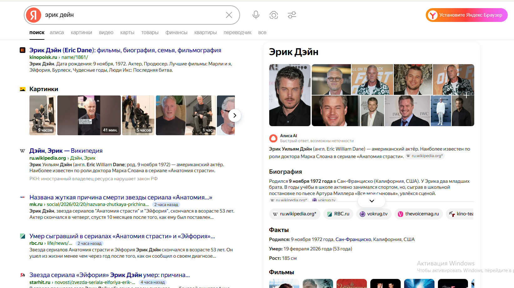 После того как «Эрик Дейн умер» закрепляется в трендах, Google обновляет карточку персоны. В Knowledge Panel добавляется дата смерти, меняется статус. Это снижает часть информационного интента прямо в SERP, но усиливает общий интерес к смежным материалам — например, к ролям в Анатомия страсти и Эйфория.